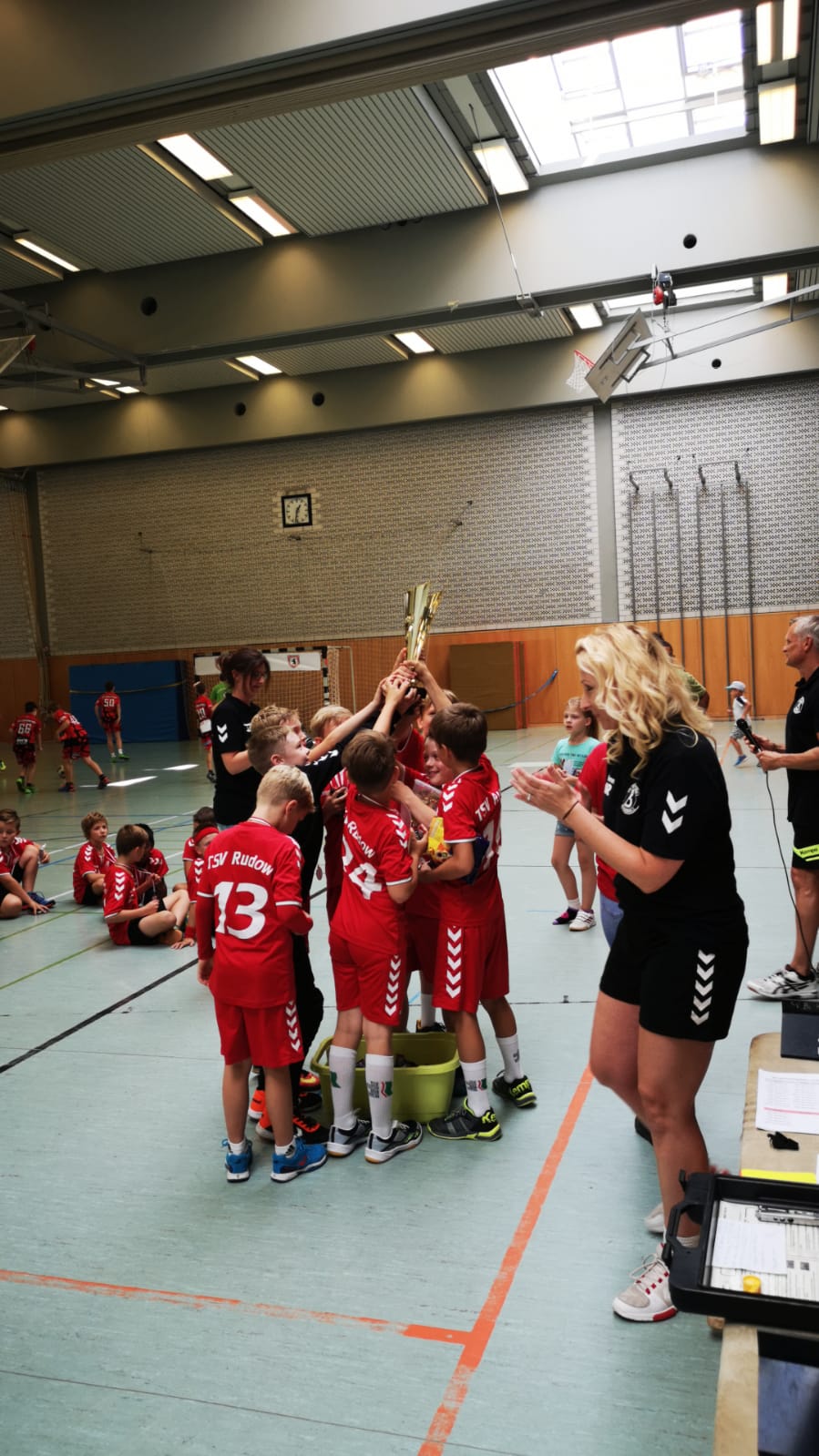 Der Turnierplan wollte es, dass die beiden Rudower Teams sich direkt im ersten Spiel gegenüberstanden. Team 1 gewann erwartungsgemäß, aber auch die Jungs von Team 2 zeigten erste schöne Ansätze. Nun warmgespielt wartete im zweiten Spiel von Team 1 gleich der zweite Turnierfavorit (und einziger weiterer Teilnehmer, der in der kommenden Saison in der A-Staffel spielen wird), der VfV Spandau. Hier zeigte sich, dass die letzten Monate des Trainings deutliche Früchte getragen hatten. Aus einer sehr guten Manndeckung wurde nach Ballgewinn schnell umgeschaltet, häufig auch der mitlaufende freie Mitspieler gesehen und konsequent abgeschlossen.