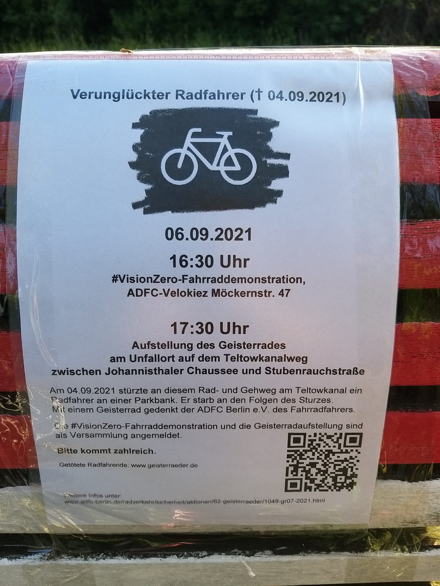 Durch den ADFC wird heute um 17.30 Uhr ein Geisterrad an der Unfallstelle (Teltowkanalweg zwischen Johannisthaler Chaussee und Stubenrauchstr. aufgestellt und dem Opfer gedacht.